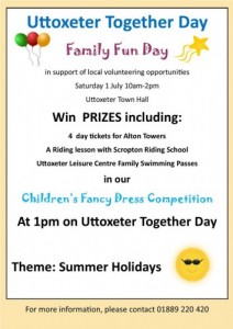 Join Careline plus many other local community groups including Holly Rd Supportive Care Centre, SSAFA, Uttoxeter Knights, Age UK , Autism Pyramid Group and Scropton Riding School on Sat 1st July from 10am at Uttoxeter Town Hall for the Uttoxeter Together Day – a family fun day which aims to bring townsfolk together. There will be games, stalls and a children’s Fancy Dress Competition at 1pm, with some  exciting prizes and which will be judged by Andrew Griffiths MP. Tesco’s Community Team will be on hand to feed your family lunch for just £4 and the Uttoxeter Friendship Group will be providing delicious homemade cakes! There will be something for everyone and if you have ever considered volunteering for a local cause, you’ll have the opportunity to find out just what’s available, whatever your age or whether you have just a few hours to spare each month or more….